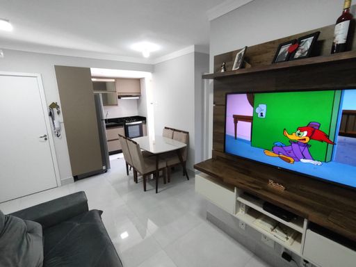 Sala, cozinha, 2 quartos com 1 suíte, 2 banheiros, varanda, área de serviço e 1 vaga de garagem coberta.